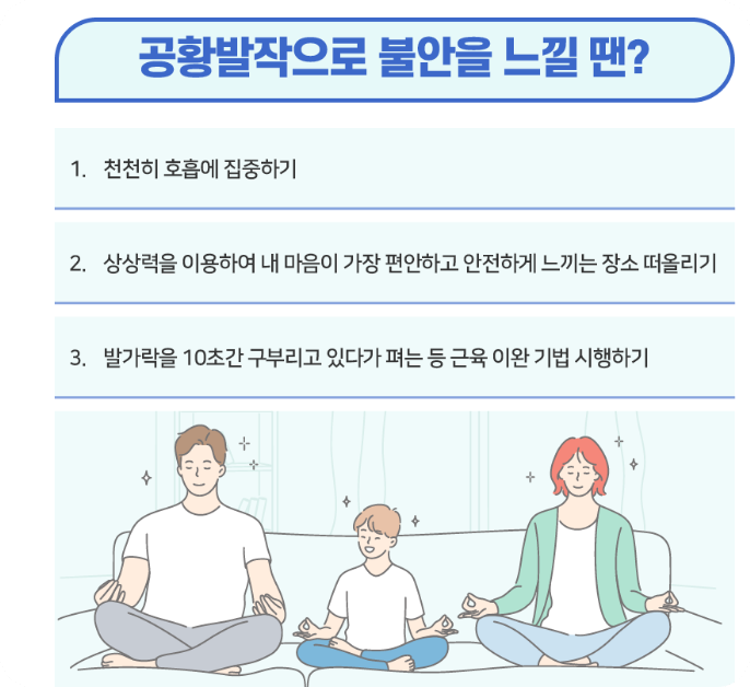 공황장애는 무섭게 느껴지지만, 조기에 발견하고 적극적으로 치료하면 충분히 나아질 수 있는 질환이에요. 평소에 규칙적인 수면과 균형 잡힌 식사, 가벼운 산책이나 명상 같은 이완 활동을 꾸준히 하는 것이 예방에 도움이 돼요.