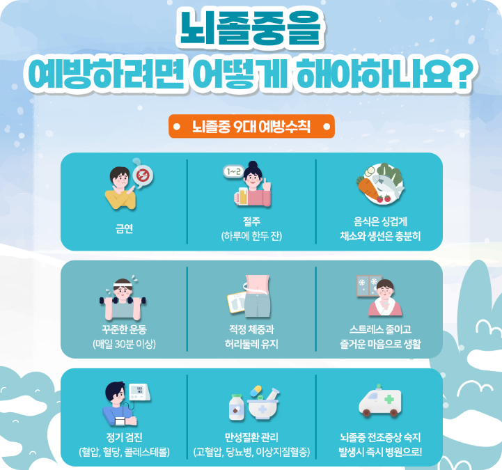 흡연과 과도한 음주는 혈관 건강을 직접적으로 해치기 때문에 반드시 줄이거나 끊는 것을 권해드려요. 또한 오늘 알려드린 10가지 증상 중 하나라도 갑자기 나타난다면, 증상이 잠깐 사라지더라도 즉시 119에 연락하거나 병원 응급실을 찾아주세요.