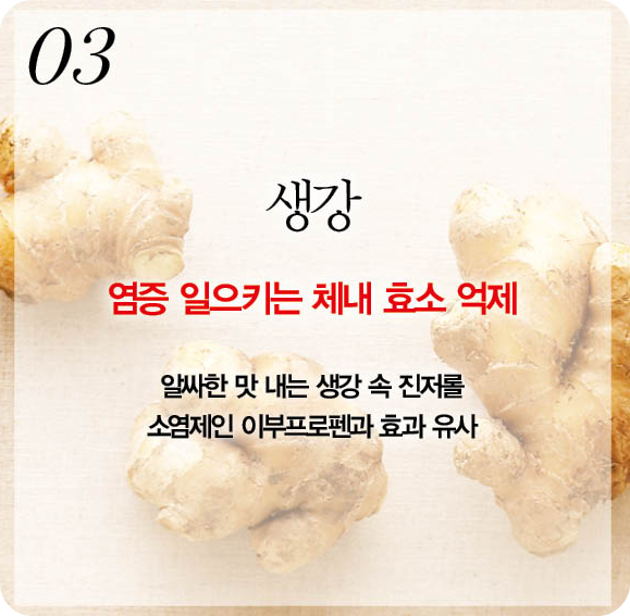 생강에는 무려 100가지 이상의 항염증 물질이 포함되어 있어요. 그중에서도 진저롤, 쇼가올, 파라돌이라는 성분들이 핵심인데요, 이 성분들이 우리 몸속에서 염증을 일으키는 신호 물질의 생성을 억제해 줘요.