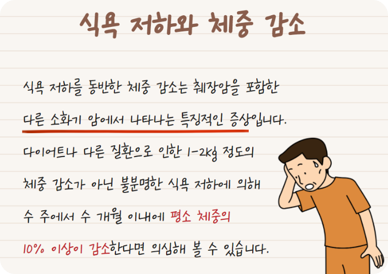 여기에 식욕 저하와 통증까지 겹치면서 음식 섭취 자체가 줄어들게 되죠. 3개월 동안 아무 이유 없이 체중의 5% 이상이 감소한다면 단순히 스트레스나 피로로 넘기지 말고 전문의 진찰을 받아보시는 게 좋아요.