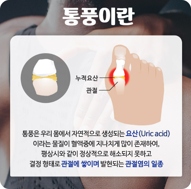 이 통증이 너무 심해서 맨발로 바닥을 딛는 것조차 힘들어지기도 해요. 평소엔 아무렇지도 않다가 자고 일어났더니 갑자기 발가락이 욱신거린다면 통풍일 가능성을 꼭 염두에 두셔야 해요.